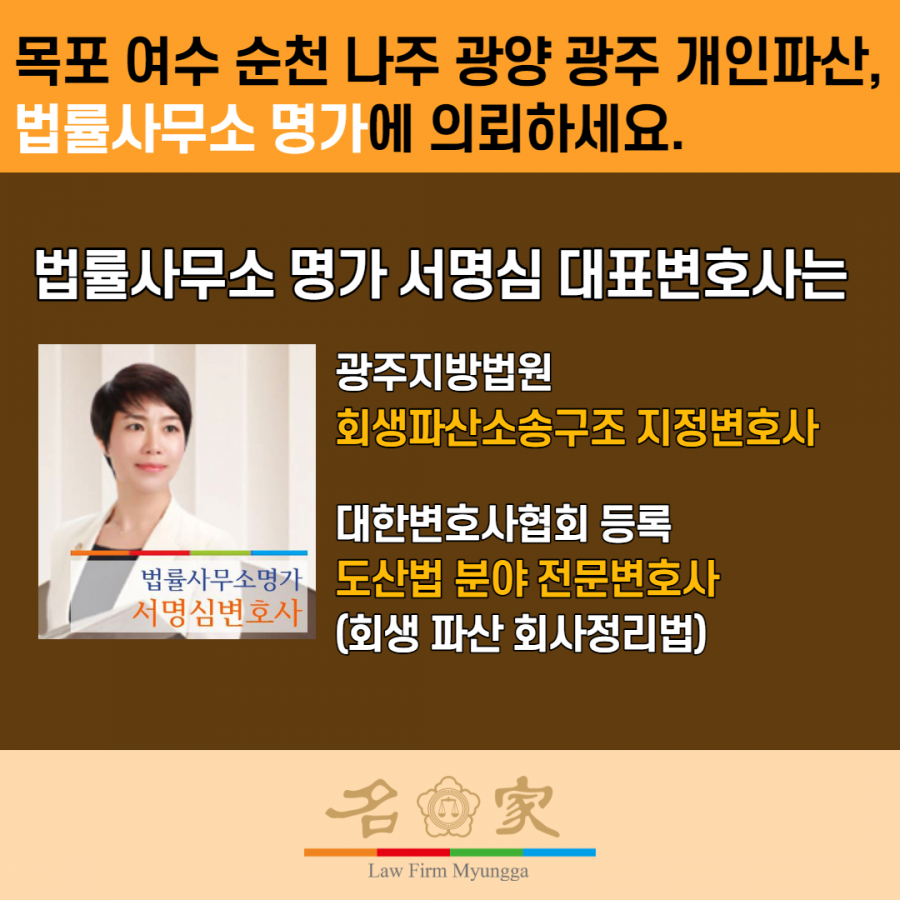 목포 여수 순천 나주 광양 광주 개인파산과 관련하여 궁금한 점이 있으시다면 도산법전문변호사가 있는 법률사무소 명가와 상담하시기 바랍니다.