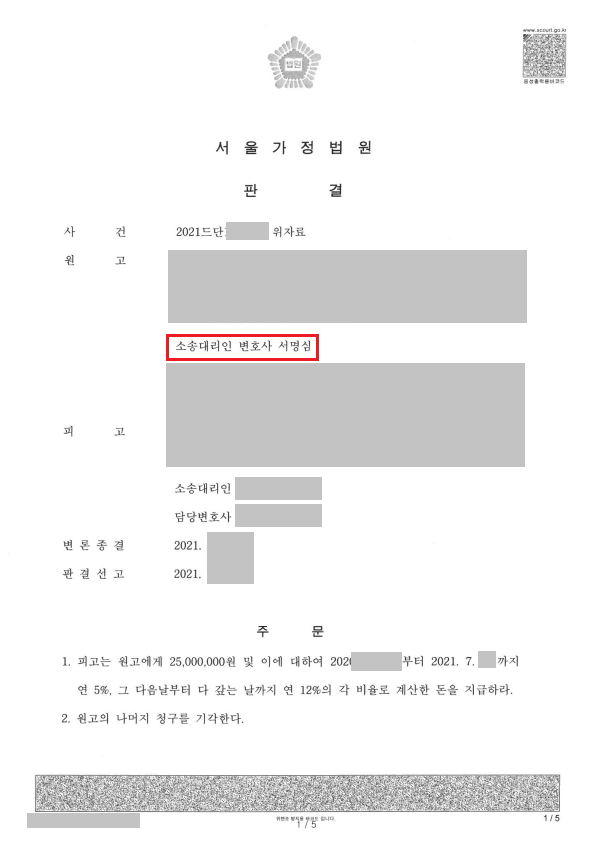 이에 저희 법률사무소 명가는 법리적 증거들을 제시하고, 피고가 원고의 남편에게 배우자가 있다는 사실을 알고 있으면서도 부정행위를 저질렀을 뿐만 아니라, 결국 이로 인하여 10여년간 평온하게 지속되던 원고의 혼인관계가 파탄에 이르렀고, 원고는 이로 인한 극심한 정신적 손해를 받고 있음을 강력히 주장하였습니다.