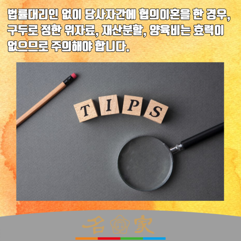 협의이혼은 긴 소송 기간을 거치지 않아도 되고 법원에서 개입하지 않으므로 이혼 사유를 따로 설명할 필요도 없습니다. 재산분할과 자녀 양육권 등에 관한 내용을 정리하면 숙려 기간만을 거치면 되고 신속하게 이혼할 수 있으므로 먼저 이를 고려해보시는 부부가 많은 편이죠. 말로만 들었을 때는 매우 간단해 보이나 진행한다면 복병이 숨어있다는 것을 캐치하고 시작해야 합니다. 당사자가 구두로 정한 위자료, 재산분할, 양육비와 같은 부분에 대해서는 그 자체만으로는 어떤 효력도 지니지 않기에 상대방이 막상 이혼하고 나서 약속한 사항을 지키지 않는다고 하여도 제재할 수단은 없습니다. 그렇기에 법률 대리인으로서 구두로 합의하는 것보다는 협의이혼 서류 신청서 자체를 철저하고 확실하게 작성해 이혼 준비를 확실히 하도록 할 것을 당부 드리는데요.